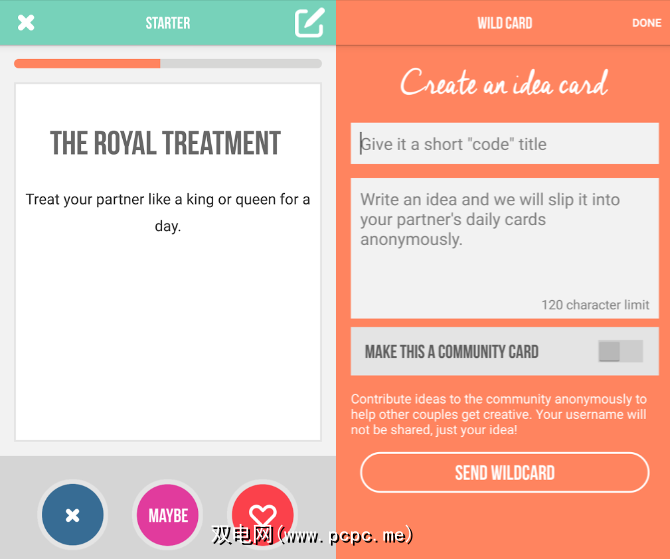 对于每一个Kindu创意卡,请依次点击 love , hate strong>,或者可能。如果您和您的伴侣的水龙头相匹配,您都会看到它。如果不匹配,则想法卡会被保密并丢弃。因此,即使您拥有公主雷亚公主的金色比基尼幻想,您的伴侣也永远不会知道他们是否不喜欢它。