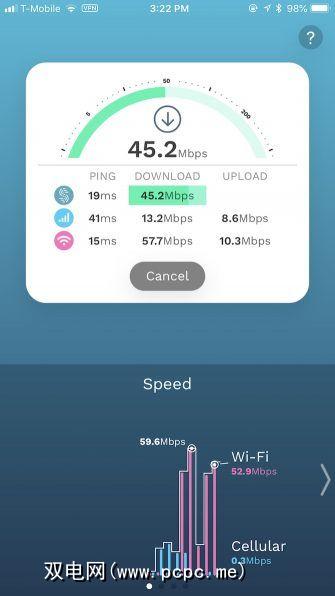 一旦打开Speedify,就会看到针对蜂窝网络和Wi-Fi网络的内置速度测试。完成这些操作后,Speedify会对它们进行组合的速度测试,以便您可以确认绑定连接的质量。 iOS应用程序甚至具有各种条形图来显示连接的健康状况。