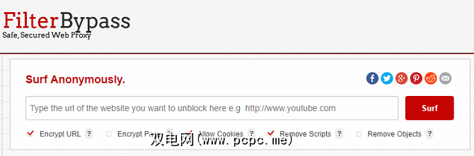 FilterBypass提供了通常的选项选择。您可以加密URL和页面,阻止cookie和脚本,并阻止cookie。