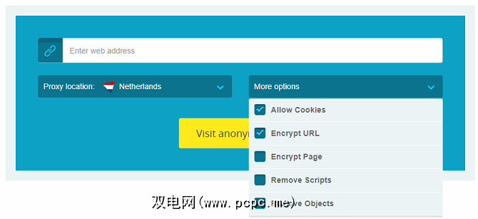 三个可用的服务器位置-美国,荷兰,和德国。其他选项包括阻止cookie,加密URL,加密页面,删除脚本和删除对象的功能。