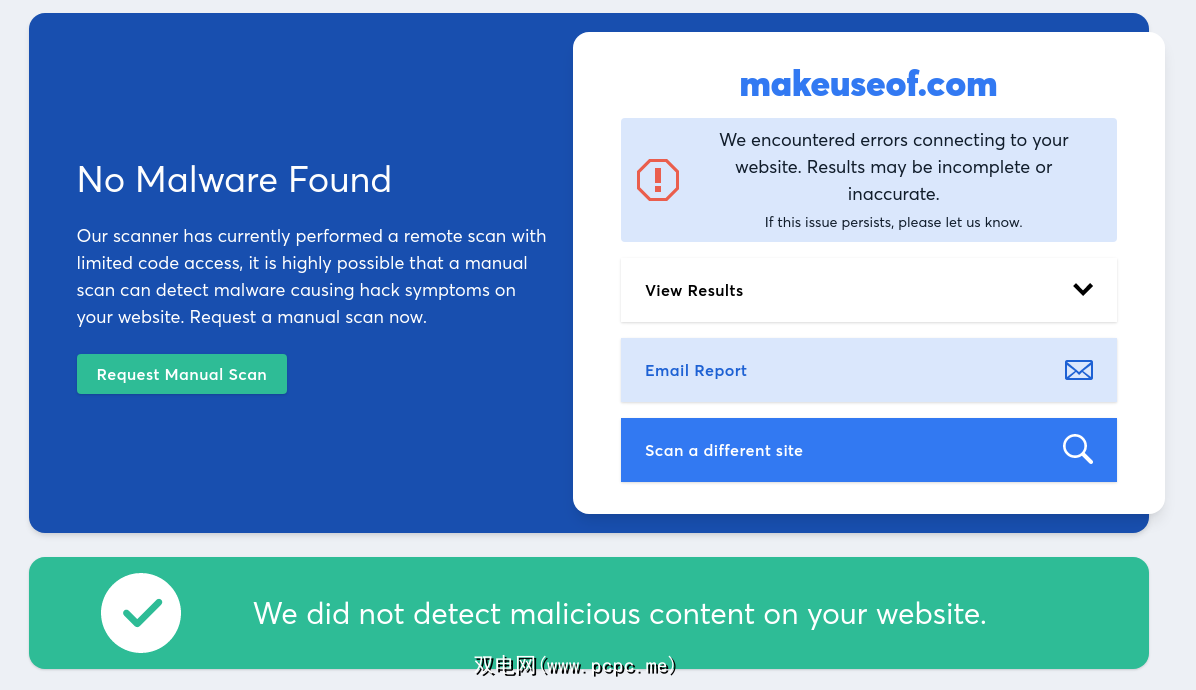 这就是在线(或外部)恶意软件扫描程序的用武之地。外部恶意软件扫描程序不需要访问您的服务器资源,并且仍然可以发现多种问题(如果有的话)。
