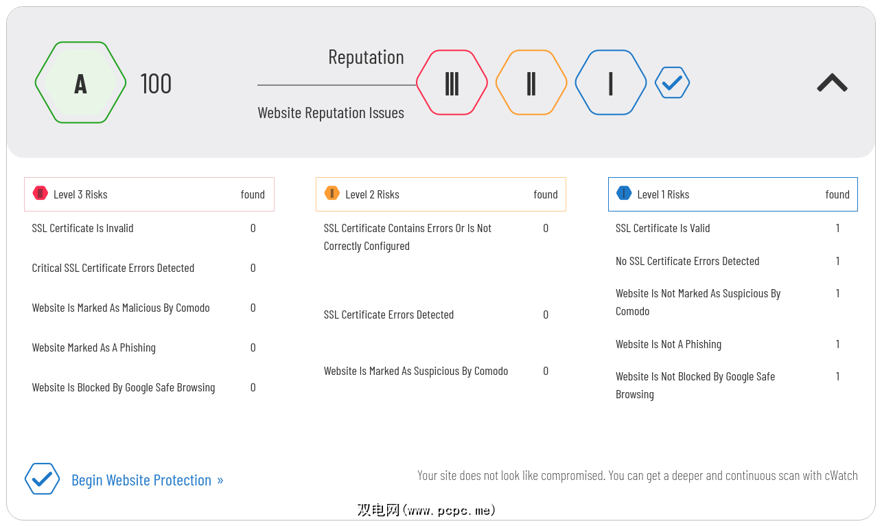 Comodo 的 cWatch 是一项网站安全服务,提供各种高级选项和免费的网站扫描仪。与其他服务相比,cWatch 的免费网站扫描服务无需任何订阅即可提供大量详细信息。但是,您必须输入您的个人/工作详细信息才能获得第一次扫描的报告。从网站声誉、恶意软件到黑名单,它对数据进行分类以使其易于理解。