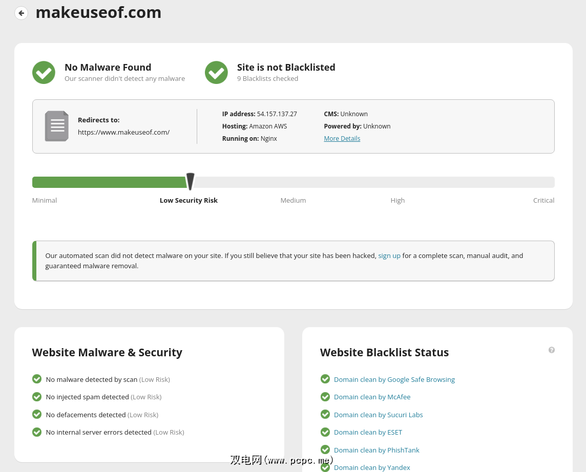 Sucuri 是一种流行的恶意软件扫描程序,可查找受影响的文件并扫描您网站上的多个安全问题。它为外部扫描提供免费的 SiteCheck 工具。