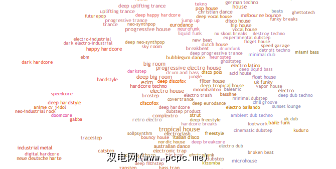 “每次杂音"是对每种音乐流派的映射,每种流派相对于其他类似流派都相对靠近。这是发现喜欢的音乐新品的好方法。别忘了,您还可以通过Spotify以及其他音乐网站发现新音乐。