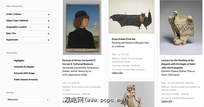 2014年,纽约大都会艺术博物馆免费发行了40万件高分辨率作品网络上可用的图像。想扩大您的艺术品味和知识?立即查看收藏集,您可以按艺术家,材料,地理位置,时代,部门等进行过滤。