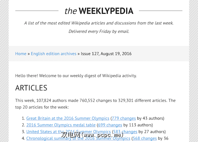 Weeklypedia是您最好的选择,因为它每周都会收集前25名编辑次数最多的文章或讨论。是的,您将获得那些毫无意义但有趣的Wikipedia编辑大战。然后将其作为电子邮件爆炸发送给订阅者,每个星期五,或者您也可以访问该网站并进行签出。