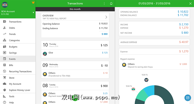 您可以跟踪自己的资金在很长一段时间内,它带有一个财务日历,可以向您发送警报和通知,它包含许多有用的(免费的)图形和图表,并且可以多种货币工作。