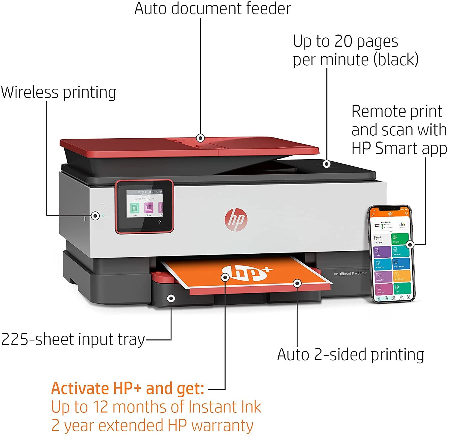 HP OfficeJet Pro 8035e 通过处理重复的打印任务来节省您的时间并提高您的工作效率。有内置的快捷方式,可让您扫描到电子邮件、云、移动设备等。您无需站在打印机附近,因为它可以通过自动进纸打印多达 35 个打印文档。