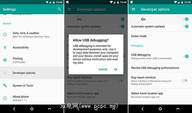 在手机上,转到设置>关于手机,然后点击内部编号七次以启用“开发人员"选项。现在点击返回按钮,然后转到开发者选项>启用USB调试,然后点击确定。