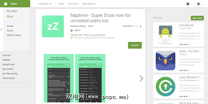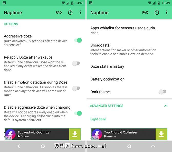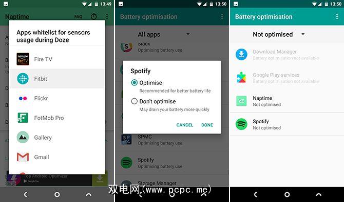 Naptime被描述为“ Super Doze",并且在节省电池电量方面更加积极。默认情况下,它将“打five"设置为在关闭屏幕五秒钟后激活。它具有一整套配置选项,包括将应用程序列入白名单的功能,以确保打算在后台运行的应用程序不会受到干扰。