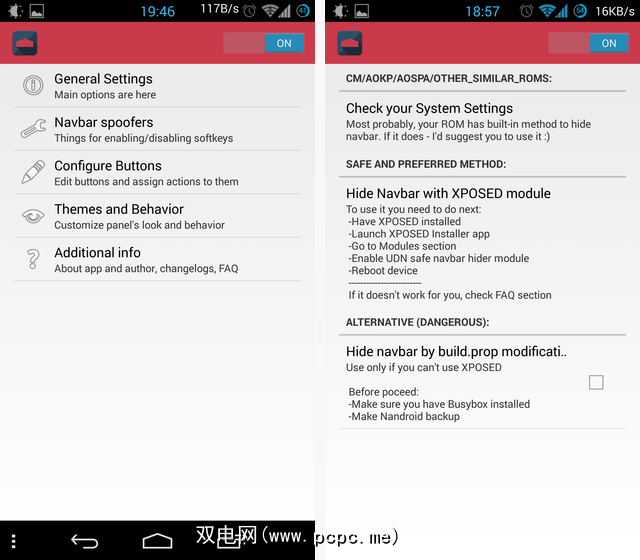 您要做的第一件事就是隐藏现有的导航栏-否则您最终将拥有两个导航栏,一个接一个。我无法捕获该屏幕截图,但是听起来很烦人和多余。因此,请点击导航栏spoofers (主菜单中的第二项)以查看您的选项。右侧显示的spoofers屏幕可以合理地进行布局:如果您已经在使用Cyanogen,AOKP或类似的ROM,Ultimate Dynamic Navbar建议您使用ROM的内置机制关闭导航栏。