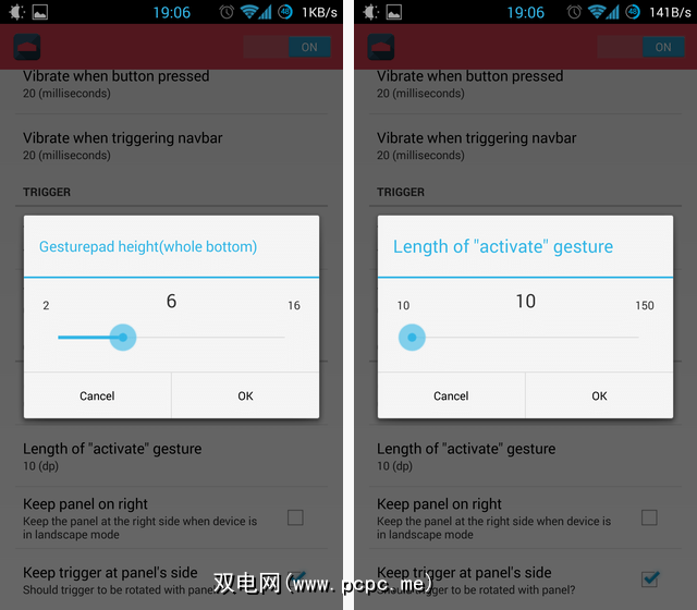 另外两个按键设置与手势板的高度和激活手势的长度有关: