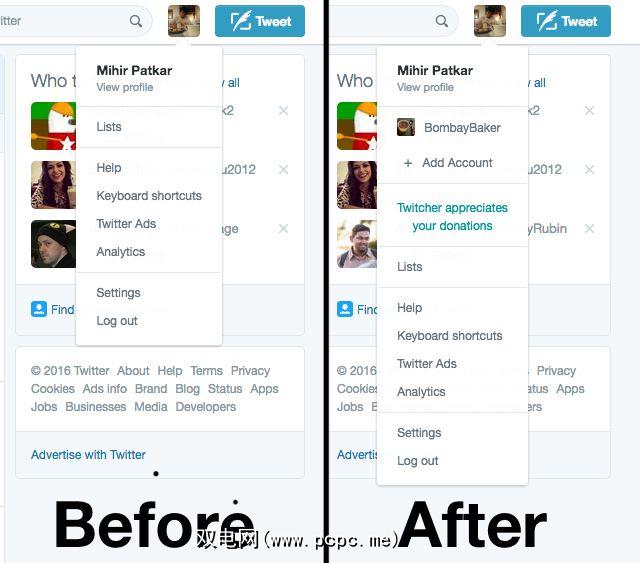 Twitter的移动应用程序使您可以使用多个配置文件登录并在它们之间快速切换。由于某种原因,Twitter for Web却没有。 Twitcher在这里解决此类Twitter限制和烦恼。