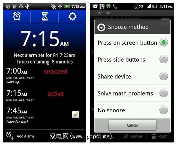 Alarm Clock Xtreme实际上是我当前选择的闹钟,虽然它的界面足够常用,但它提供了一些暂停闹钟时的独特功能。该应用程序可自定义,可让您微调所有内容,从警报声音和配色方案到暂停时间和关闭选项。您可以一次设置多个警报,在某天关闭警报,而在其他天不关闭,并轻松激活或停用列表中的任何警报。
