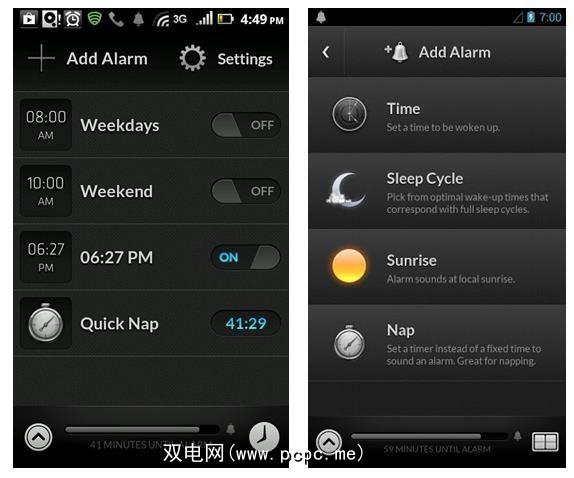 在我甚至没有介绍其功能之前,DoubleTwist闹钟就其界面而言就是独一无二的。许多闹钟应用程序的界面都有待改进,但DoubleTwist闹钟是我一段时间以来见过的最好看的应用程序之一。单独的界面使该应用值得一试,但是还有其他独特的功能值得关注。您添加的每种警报都可以是常规警报,但是如果您喜欢这种情况,它还取决于您的睡眠周期或日出时间。还有一个专门针对60分钟或更短时间的小睡的警报,它使您可以设置快速警报,而不必计算您想何时醒来。