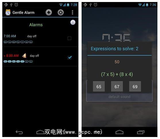Gentle Alarm is a very well-known alarm clock app, and no list is complete without it. Gentle Alarm can be anything you want it to be, from the most generic alarm-clock app, to the most unique one you can find. Aside from the regular alarms you can set for certain days (free version doesn’t ring on Wednesdays), there are lots of other features you can configure and control. Similar to Alarm Clock Xtreme, snoozing or dismissing can be done by solving a math problem or by repeating a dot pattern.