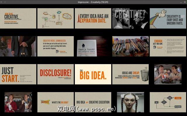 如果您不想放弃印象深刻,但仍然想尝试新事物,印象深刻是一个不错的选择。简而言之,它是演示文稿的后处理工具。在所需的任何应用程序中创建演示文稿,将其导出为PDF,然后使用Impressive进行显示。这似乎是违反直觉的(或仅仅是多余的),但Impressive具有一些吸引人的功能来打动您。