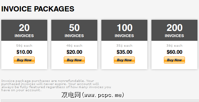 根据可以使用的发票数一次购买,总共有四个发票包。如果您有坚固的客户群并计划定期使用Billbooks,那么选择其中一种价格较高的软件包是个好主意。这样,您就不必为每张发票支付更少的费用。另外,由于发票永不过期,因此您不必担心在一定时间内使用或丢失发票。