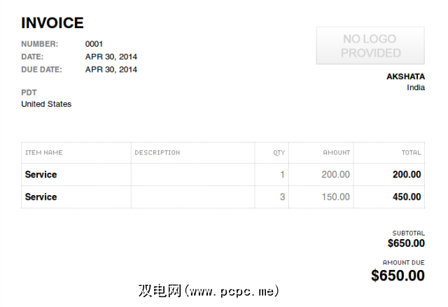 如果要将发票标记为重复,设置自动提醒或提供折扣,请查找快速设置< / em>面板上进行更改。下图是您期望默认发票模板的样子。
