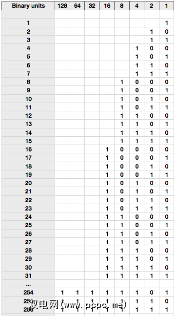 我上面显示的表是8位,因为我们最多可以有8个零和一个二进制数。因此,我们可能代表的最大数量为 11111111 或 255 。这就是为什么要表示 0-255 中的任何数字,我们至少需要8位。八位字节和字节只是表示8位的另一种方式。因此, 1字节= 8位。
