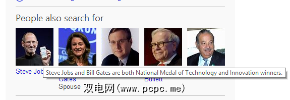 Bing还提供了其他改进,例如解释了您与人之间的联系将鼠标悬停在图片上,然后搜索“相关"部分中的人物。同样,使用比尔·盖茨(Bill Gates)示例: