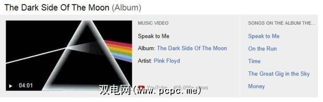 也许新的Bing Music视频搜索最酷的功能是它不仅可以给您“单身",而且可以使您专注于在“专辑"上。例如,平克·弗洛伊德(Pink Floyd)的《月之暗面》是一本旨在完整且顺序地收听的专辑,因此,如果您要从中搜索歌曲,必应还将为您提供“专辑"模式来收听