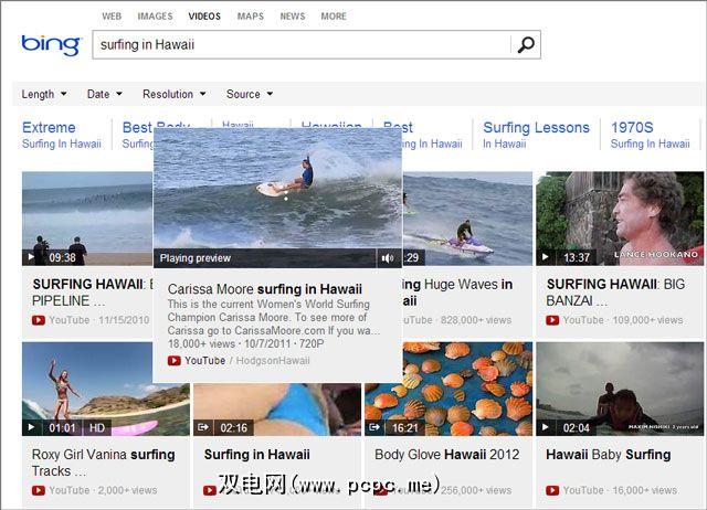 Bing说,视频搜索是从头开始设计的。点击搜索后,视频结果来自YouTube,Hulu,Vimeo,Dailymotion,Vevo,MTV,CBS,MSN等网站。您无需再去源站点捕获预览,因为您可以将鼠标悬停在该站点上,然后弹出视频开始在此处播放,然后在缩略图中播放。视频的信息(例如观看次数和分辨率)显示在下方。小型视频预览还具有音量按钮。这些更改可帮助您节省搜索正确视频时的时间。