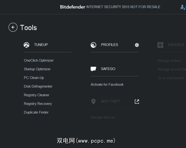 此处还包括磁盘碎片整理,注册表清理器,注册表恢复和重复查找器,以及Bitdefender Internet Security 2015的配置文件和用于在Facebook上进行安全社交网络的Bitdefender Safego工具。