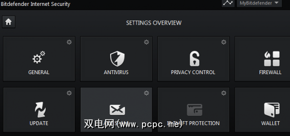 启动Bitdefender Internet Security之后,您将被带到主屏幕,在那里您可以进行调整和自定义程序提供的所有选项。此页面上可用的选项列表很广泛,如下所示: