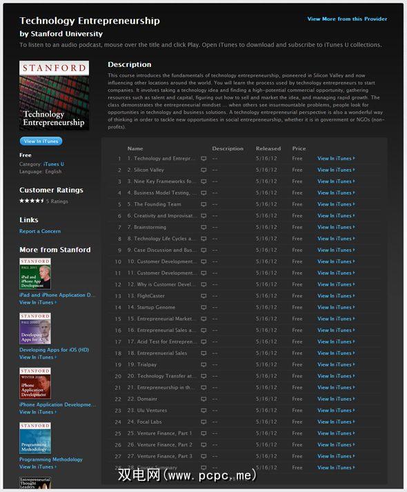 在Chuck Eesley提供的iTunes U上享受技术上最好的企业家智慧( @eesley),斯坦福大学教授。创业已有很长的历史,但由于硅谷的热潮,这个词一度陷入困境。介绍了开办企业的基础知识,然后从28个播客中带您进入整个流程链,直至必须管理快速增长的阶段。播客是免费的,特别是关于技术的播客,但它们同样也可以很好地应用于其他领域,例如社会企业家精神。正如描述所言–它鼓励进取的心态,这没有什么问题,而是解决方案。您还可以在YouTube上播放播放列表。