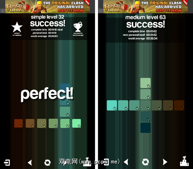 您可以将片段拖动到它们的位置,这将导致上面左图所示的线条动画,或者您可以点击彩色正方形,然后点击您想要它去的地方,如上面的右图所示。如果您能在第一次尝试中都能获得所有这些,那么您将获得完美之星。如果您能在世界平均水平之前获得它,那么您将获得奖杯。