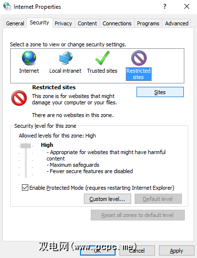 打开控制面板并导航至网络和Internet > Internet选项。移至安全性标签,单击受限制的站点并使用下面的按钮打开站点对话框。