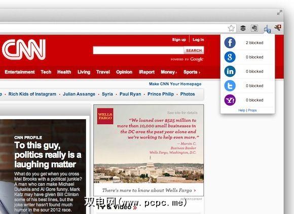 在浏览器中安装了DNT +之后,每当您访问网站时,浏览器栏中的图标都会告诉您被阻止了多少个社交网络,广告网络和公司。通过展开每个部分,您可以确切地看到其中哪些公司已被阻止。例如,当访问CNN.com时,您可以使用DNT +自动阻止Facebook,Nielsen等。 DNT +还允许您选择在任何给定站点上禁用该服务。