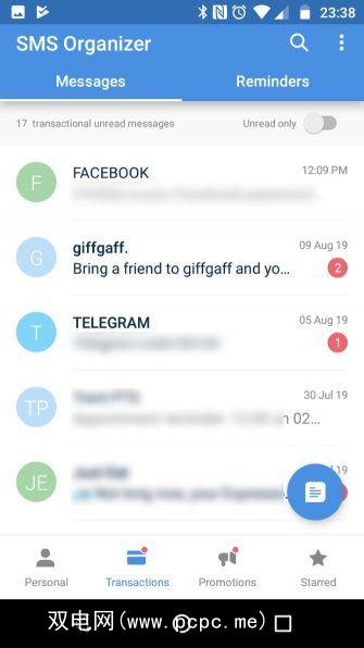 使用SMS Organizer,您还可以为对话加注星标,将其放入加星标文件夹中(就像Gmail一样)。有一个名为提醒的文件夹,该文件夹向您显示在梳理文本后生成的信息卡。