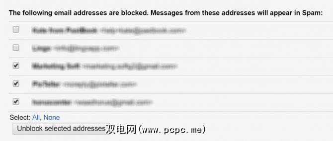 转到Gmail设置(通过点击齿轮图标)。点击过滤器和被阻止的地址标签。向下滚动到屏幕底部,您将看到被阻止地址的列表。您必须滚动浏览在列表中找到您要取消屏蔽的联系人,然后点击取消屏蔽链接。您还可以选择多个或所有地址,然后单击取消阻止所选地址。在出现的弹出窗口中,单击取消阻止按钮以确认您的选择。 如何阻止来自某个域的所有电子邮件