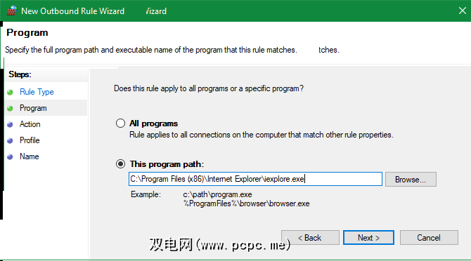 在生成的规则类型上>窗口,选择程序,然后点击下一步。然后,您需要浏览到Internet Explorer的可执行文件。