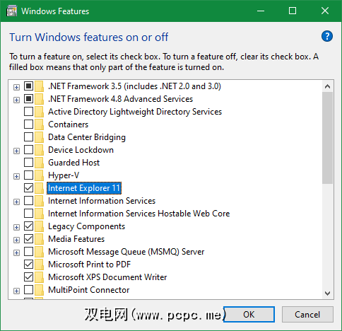 在“开始"菜单中搜索 Windows功能,然后选择打开或关闭Windows功能。 条目。这将带您进入带有Windows可选功能列表的面板。在这里,取消选中 Internet Explorer 11 的复选框,然后单击确定。