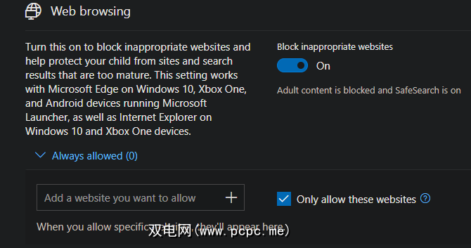 如果选中仅允许这些网站框,则可以限制它们只浏览那些页面。将其与空白列表结合使用,即可有效阻止Internet Explorer访问互联网。当然,这仅适用于孩子的帐户,但仍然有用。