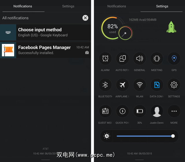 上面,您可以看到通知栏和“快速设置"菜单的外观。该设置类似于Sony Xperia Z3的设置,带有 Notifications 面板和 Settings 面板。 Notifications 面板看起来非常储备,右上角只有一个修饰的X可以清除所有通知。