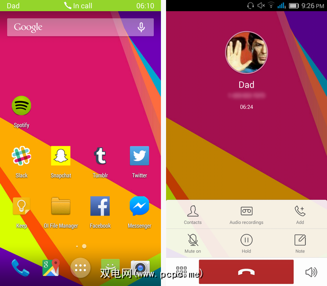您可以看到通话中的样子以上。通话中屏幕会使用手机的背景,并带有较小的联系人图片,这看上去确实不错。如果您在通话时要执行多任务处理,则会看到绿色的通知栏,让您知道自己仍在通话中。