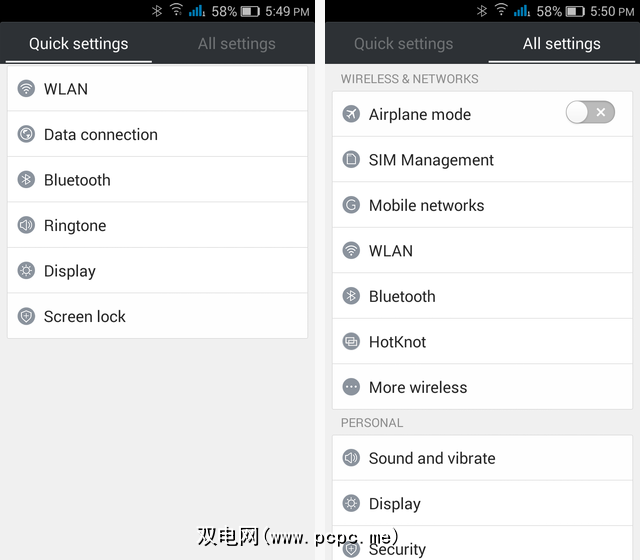上面是设置菜单,还分为两个选项卡:快速设置和所有设置。您可以在所有设置菜单中找到以熟悉的方式排序的大多数可预测的Android设置。