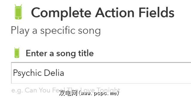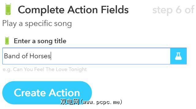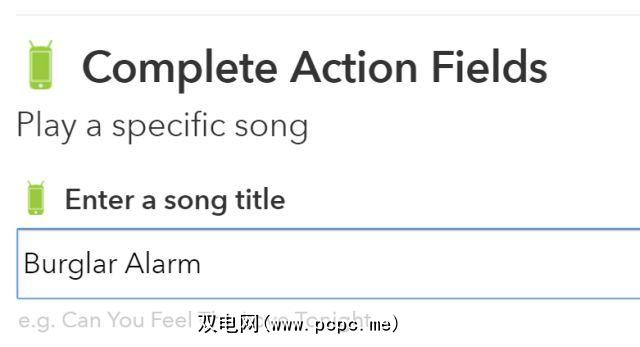 选择Android设备或iOS设备作为操作,然后“播放特定歌曲"。输入您想播放的歌曲标题,作为每晚的“上床睡觉"提醒警报。