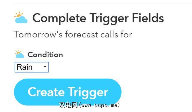 借助简单的IFTTT自动化,您可以在早晨收到声音警告,以确保您不会发生这种情况。只需在IFTTT上选择“天气"频道,然后选择“明天的天气预报"即可。将条件设置为“雨"。