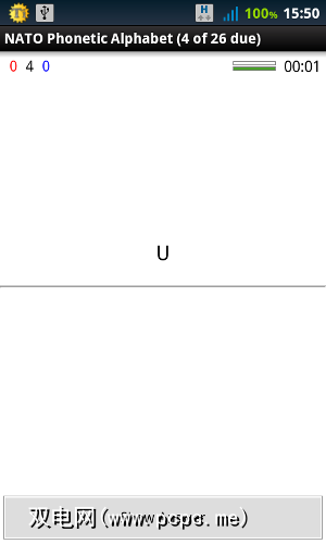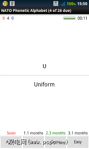 这是一个非常简单的卡片组,所以问题仅由一个字母组成(意思是,“北约语音字母中U代表什么?")。思考完毕后,点击显示答案: