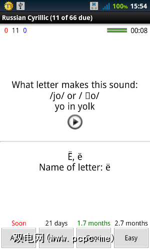 您可以将答案分为四个等级。 “再次"通常意味着您只是不知道答案,其他人都是不言自明的。如您所见,如果我说这对我来说是个难题,那么比起我说容易,我会更快地看到这个问题。在这两种情况下,间隔都非常长,因为我已经在此平台上工作了一段时间,而且我实际上已经知道了这些东西(并且AnkiDroid正确地选择了这个东西)。