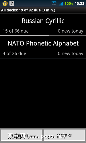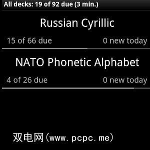 就像Anki一样,AnkiDroid的系统也基于“甲板闪存卡"。您在上面的屏幕上可以查看本地平台的状态,并将其与Anki服务器同步(需要一个免费帐户)。正如您可以从细细的白色进度条看到的那样,我的北约语音字母比我的俄语要好(我已经使用AnkiDroid大约两个月了。)