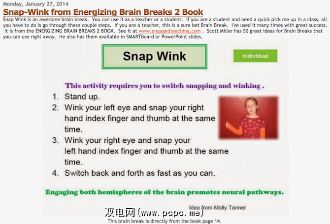 老师本人戴夫·斯拉德基(Dave Sladkey)创造了一系列此类脑部休息。这些不是难题。练习涉及“快速眨眼"之类的事情,在这种情况下,您眨动左眼并同时捕捉右手的拇指和食指。然后,您切换到另一只眼睛和另一只手。尝试以最快的速度来回切换。