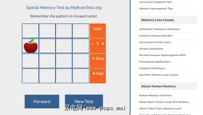 工作内存测试有两种。数字跨度测试以不同的速度向您显示一系列数字(最多10个),然后您需要输入完整的数字。空间记忆测试显示了一个对象处于4×4网格的不同正方形中。记住该序列并复制它。