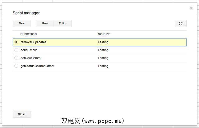 3。要运行脚本,只需转到工具-脚本管理器并选择所需的功能。该函数的名称与脚本第一行中的名称相对应,即 function removeDuplicates()导致脚本被称为 removeDuplicates 。