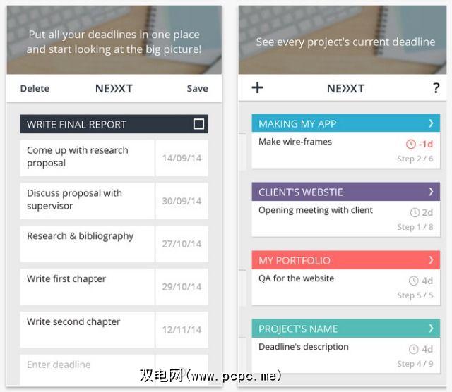 iOS的 Next Deadline应用程序可以通过为每个任务设置截止日期来帮助您组织任务并确定优先级。该应用程序的主要优点之一是,它可以帮助您在一个较大的期限内管理多个期限,从而使大型项目的威胁程度降低。